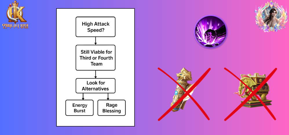 On the other hand, fast attackers or units with attack speed buffs still get some value out of Adrenaline Rush, but it’s more limited now. Just keep in mind that Adrenaline Rush doesn’t work well with Immortals like Hannibal or Alexander, who have high attack speeds but have artifacts that make their energy gain passive.