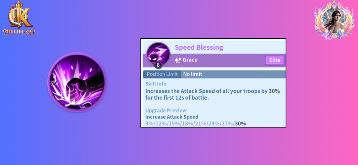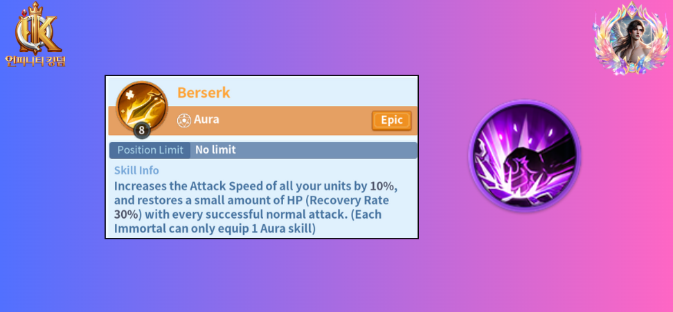 Berserk increases attack speed by 10%, and although it's less impactful compared to Speed Blessing, it lasts for the whole battle and helps in sustaining a higher attack speed throughout the battle. While it might not offer the same burst early on, it supports more consistent ultimate cycling, making it a good option for longer fights when combined with Adrenaline Rush.