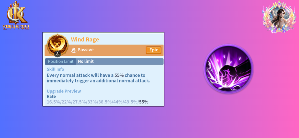 Wind Rage continues to be a solid choice to pair with Adrenaline Rush. Its extra normal attacks trigger Adrenaline Rush more frequently, giving you more chances to reduce the cooldown of ultimate skills. This combination remains effective for quick-paced builds that benefit from frequent ultimate cycling, especially for Immortals focused on offense.