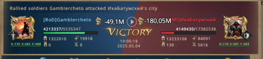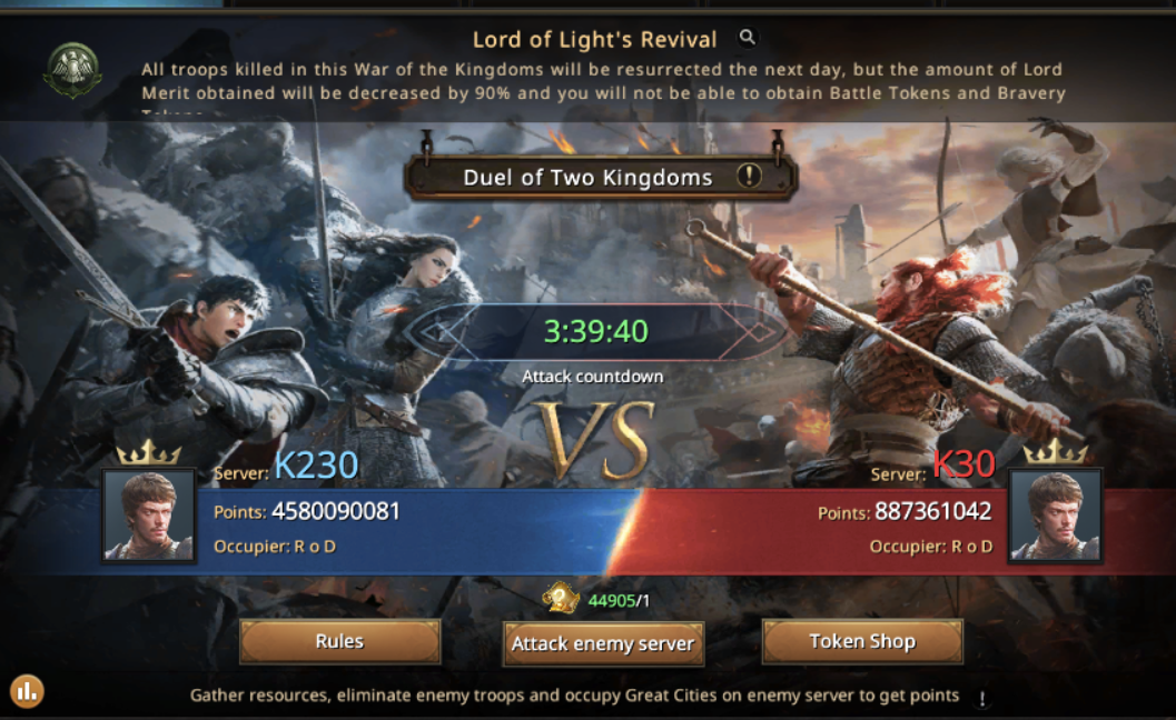 She landed there, greeted her old friends – muted, Night Arrow, Bul and Gamblercheto. She led a lot of fights together with them, and she knew that with them she will be safe and supported in any fight she lead. Together, they started preparing for KvK. Trained their best armies, checked the walls and sharpened the weapons. All was ready for the upcoming battle. This time KvK will meet two kingdoms under the blessing of Lord of Light “Revival” which means that all killed soldiers will be resurrected on the next day.