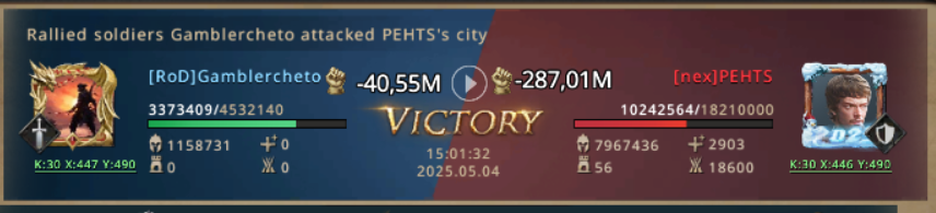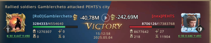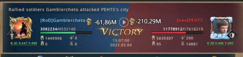 Gamblercheto immediately called a rally against the attacker. Meanwhile solo attacks were flying to the fillers of nex alliance, who started the war. There was no mercy! Everyone who dared to unbubble was attacked. The rally on nex killed their troops, making them not able to participate anymore in KvK. And the hunt on k230 started!