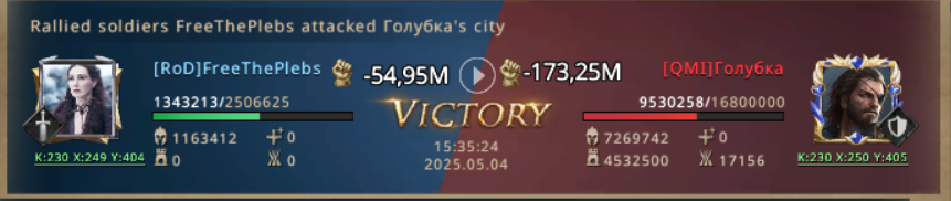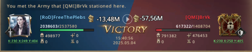 But the second rally started and she realized that her own kingdom is attacking own members on KvK, without agreement to do! This was roughly break of the rules! FreeThePlebs raised the war horns to call her friends to defend their honor, and the war between k230 started.