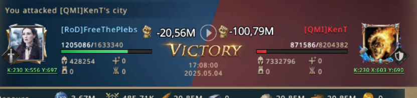 KvK instead of kingdom event turned into a mascara. QMI, the rulling alliance decided to break the rules too and started attacking RoD members. The warriors from RoD defended their honor. They fought side by side, protecting eachother They proved that together, no one can beat them.