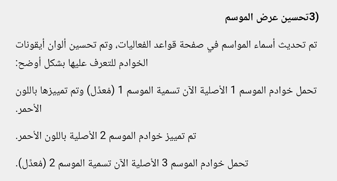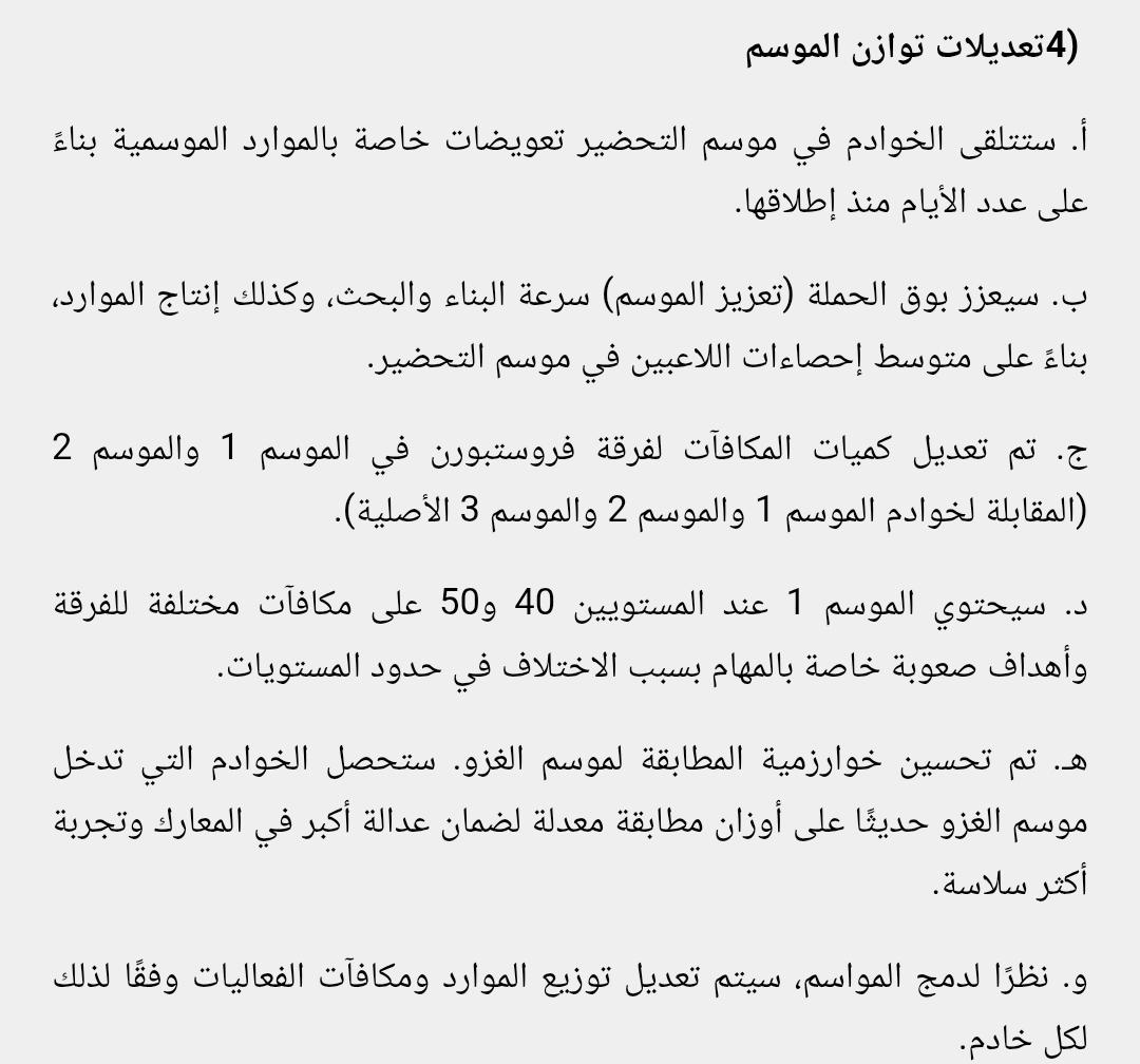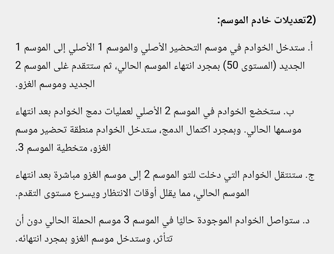 نظرًا لدمج المواسم سيتم تعديل توزيع الموارد ومكافآت الفعاليات وفقًا لذلك لكل خادم