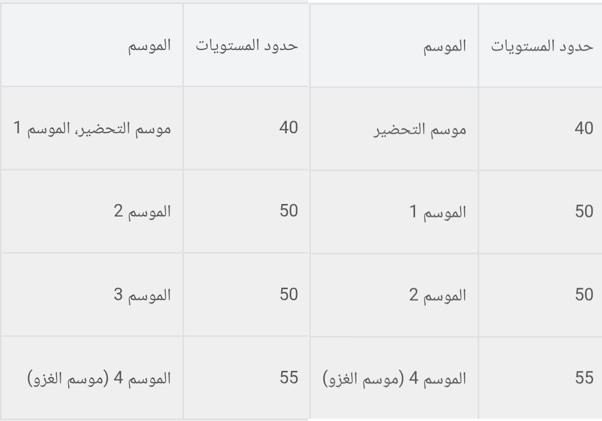 سيحتوي الموسم 1 عند المستويين 40 و50 على مكافآت مختلفة للفرقة وأهداف صعوبة خاصة بالمهام بسبب الاختلاف في حدود المستويات