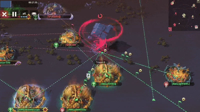 At Tower 4, AWG destroyed one relocation while SF destroyed three, giving SF a 7-to-4 advantage. However, it didn’t matter. Those AWG members who made it were stronger than the SF members present. AWG quickly zeroed three players near the tower and held SF off the tower until more AWG showed up. In just a few minutes, it was AWG who wrestled control of the tower’s vicinity. That is, until one of SF’s strongest members relocated to Tower 4 at the 10-minute mark, and AWG didn’t have an answer for him. With his help, SF zeroed multiple players and finally captured the tower at the 18-minute mark, giving SF their second tower of the match to AWG’s three. AWG captured the Central Tower with no resistance.