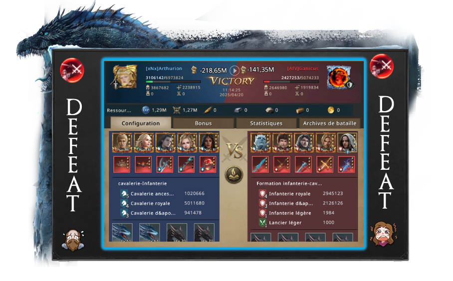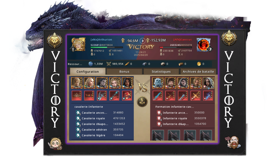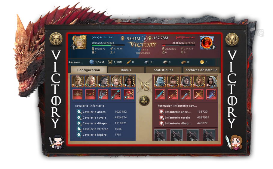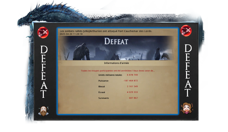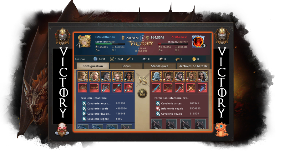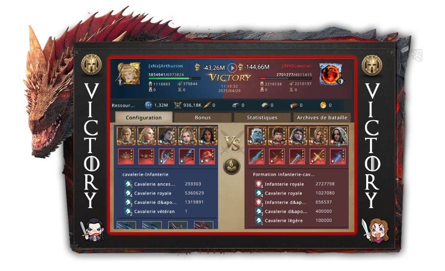 Arthurion was still quite proud of having managed to organize a worthy opposition so quickly. What would have happened if he had given up on changing alliances? Would there have been no fighting? Everyone yearns for peace, but you still have to wage a little war from time to time! He was also a little disappointed to see that even the greatest commanders in Westeros had remained with AfV. Arthurion and his team would have deserved more than just battle diamonds as a reward. That's when Arthurion had his best idea of the day: next time, he'd make entry into his alliance a paywall, that way he'd get a little extra bonus.