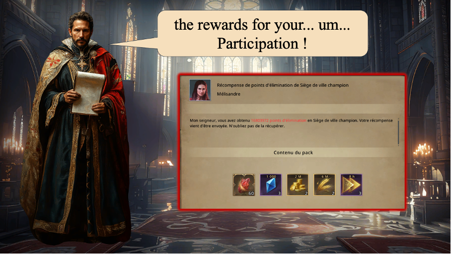 But once inside the castle, it was impossible to get in. It quickly filled up. 30 defenders were there, and no room for Arthurion or his acolytes. And since there were no willing opponents to confront them, there was no chance the city would empty… It wasn't long before Arthurion decided to leave the alliance, return to his original alliance, and attack Ganicus. It was the only way to score some points.