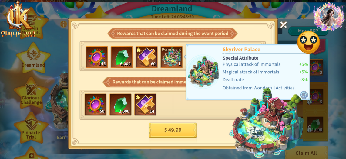 - Skyriver Palace Castle Skin (Physical Attack up to +15%, Magical Attack up to +15%, Death Rate up to -6%)