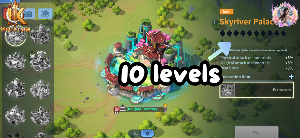 If you buy the Battle Pass for $50, you’ll unlock level 1, a solid Castle Skin with +5% Physical and Magical Attack and Death Rate Mitigation. But that’s just level 1. This skin, Skyriver Palace, can be upgraded all the way to level 10, reaching up to +15% Attack and -6% Death Rate.