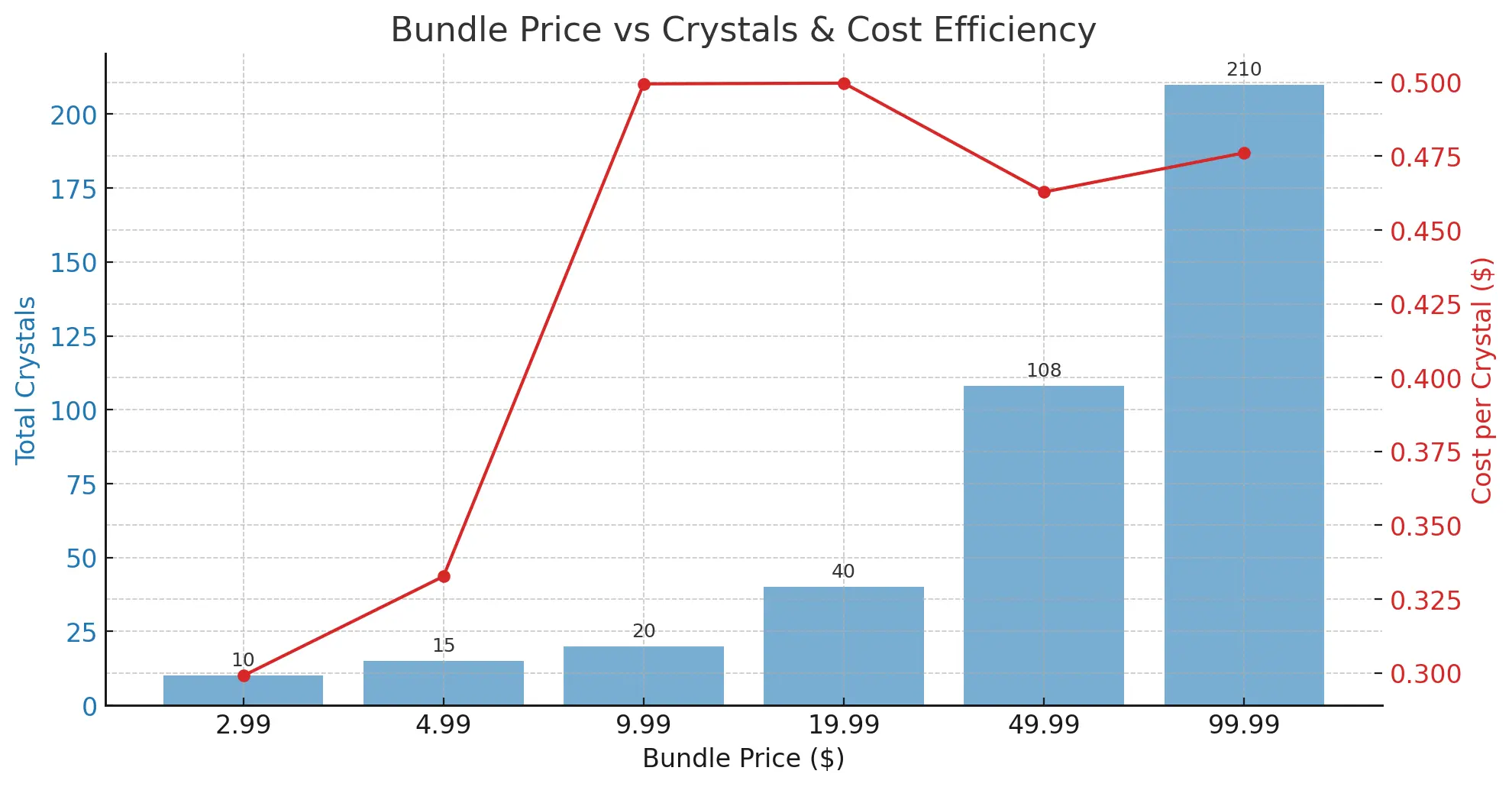 Odds for top-tier prizes are still under 3%. You can spend up to $99.99 for 210 Crystals — but unless you’re chasing the leaderboard, it’s a gamble.