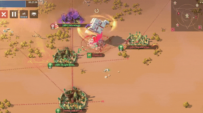 In the center, the three ARC players immediately bombarded the two HH members with solo attacks sprinkled with rallies. All HH could do was try to weather the attacks. ARC relocated next to their enemies which HH should have destroyed. By the 7-minute mark, ARC controlled the area around the Central Tower. A minute later, multiple HH players started relocating to the center. ARC managed to destroy some, but the mismanagement of their marches cost them others. HH even spent a teleport to try to overwhelm the middle. ARC responded with their own backup and teleports and took the Central Tower at the 13-minute mark, giving them their win condition of three towers. The match was essentially tied.