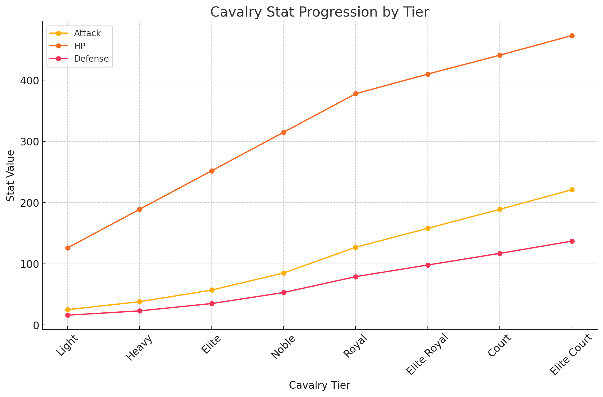 Here’s the cavalry troop stats progression by tier, based on the current in-game values. If Tier 9 is introduced, we can reasonably expect a jump similar to what happened between Tier 4 and Tier 5, a sharp increase in attack, HP, and defense, dramatically widening the power gap.