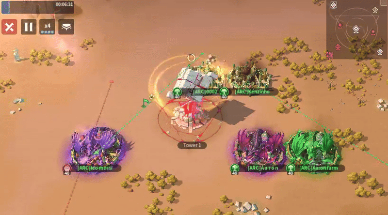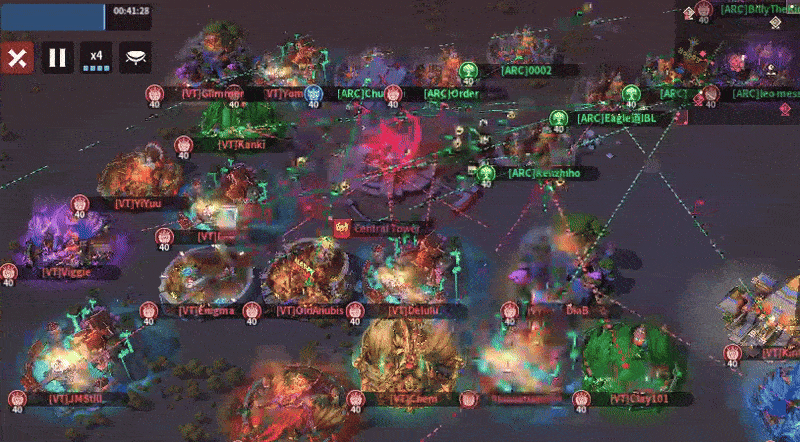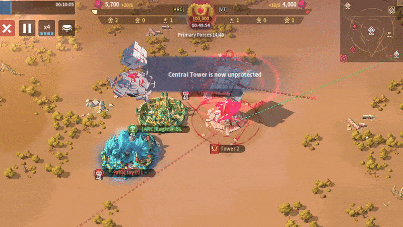 At Tower 1, ARC quickly focused and zeroed the lone VT player who relocated to their side of the tower. Then those at the top focused on the closest enemy on the left and those on the right focused on the closest enemy on the bottom. All of the VT members at Tower 1 were losing solo attacks and defenses. In less than four minutes, ARC zeroed every player without suffering a single casualty. They captured the tower at the six-minute mark. VT tried to send five players back to Tower 1, but ARC masterfully blocked and destroyed all of them, forcing VT to relocate further away. A couple of ARC members started relocating to the center. They should have gone to Tower 4 instead.