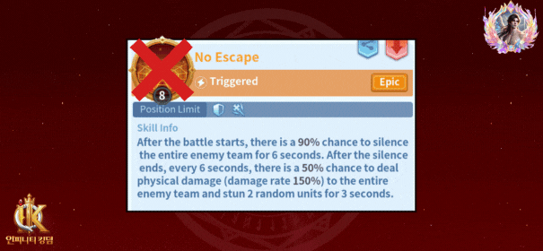 Stun: After the initial silence, every 6 seconds, there's a 50% chance that 'No Escape' will inflict 150% physical damage on all enemies and stun 2 random units for 3 seconds.