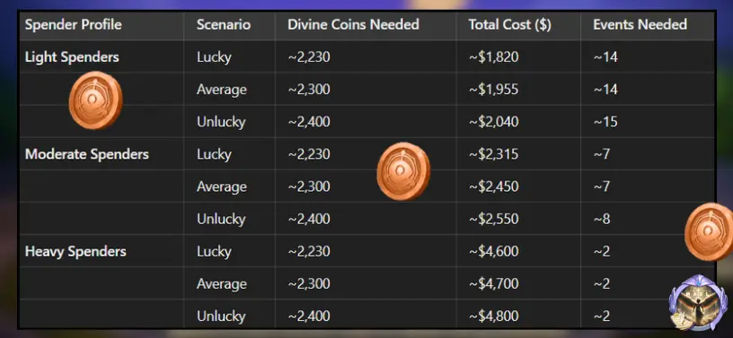 With an estimated average of 45 to 48 pulls per success, players need roughly 2,300 Divine Coins to max one skill—assuming average luck.
