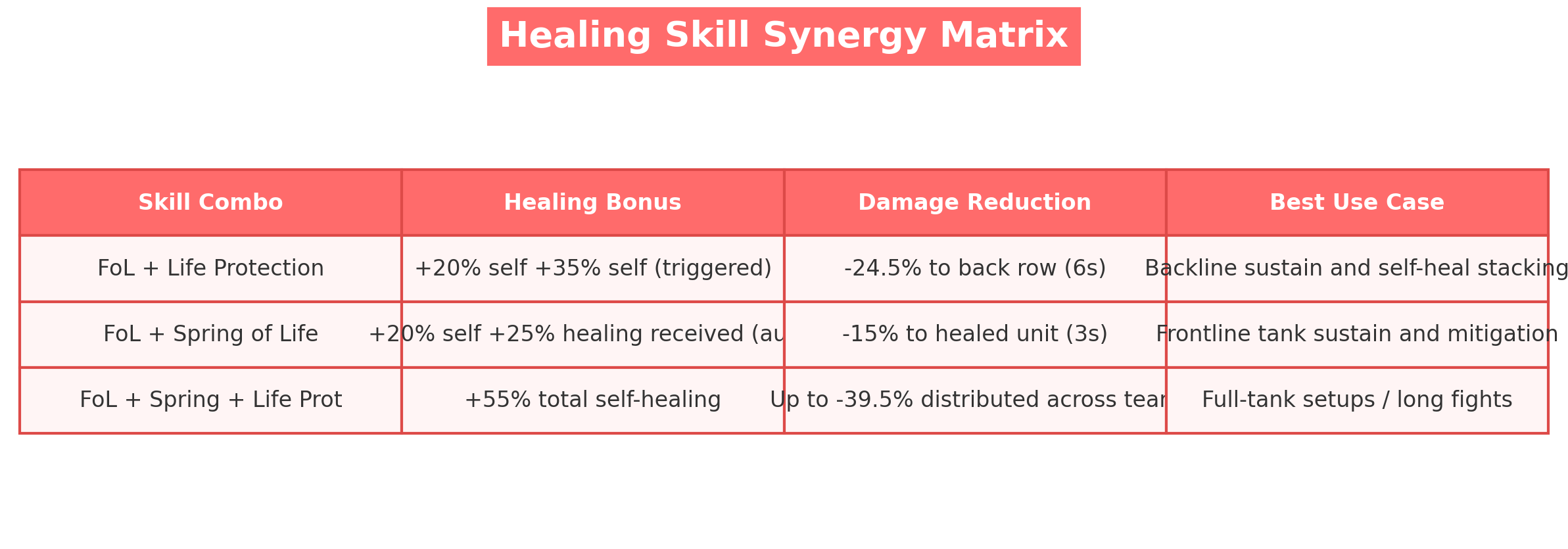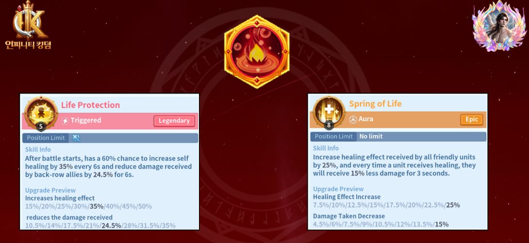 - Fountain of Life + Life Protection: Strong synergy for self-healing and back-row protection. Their healing bonuses stack well.