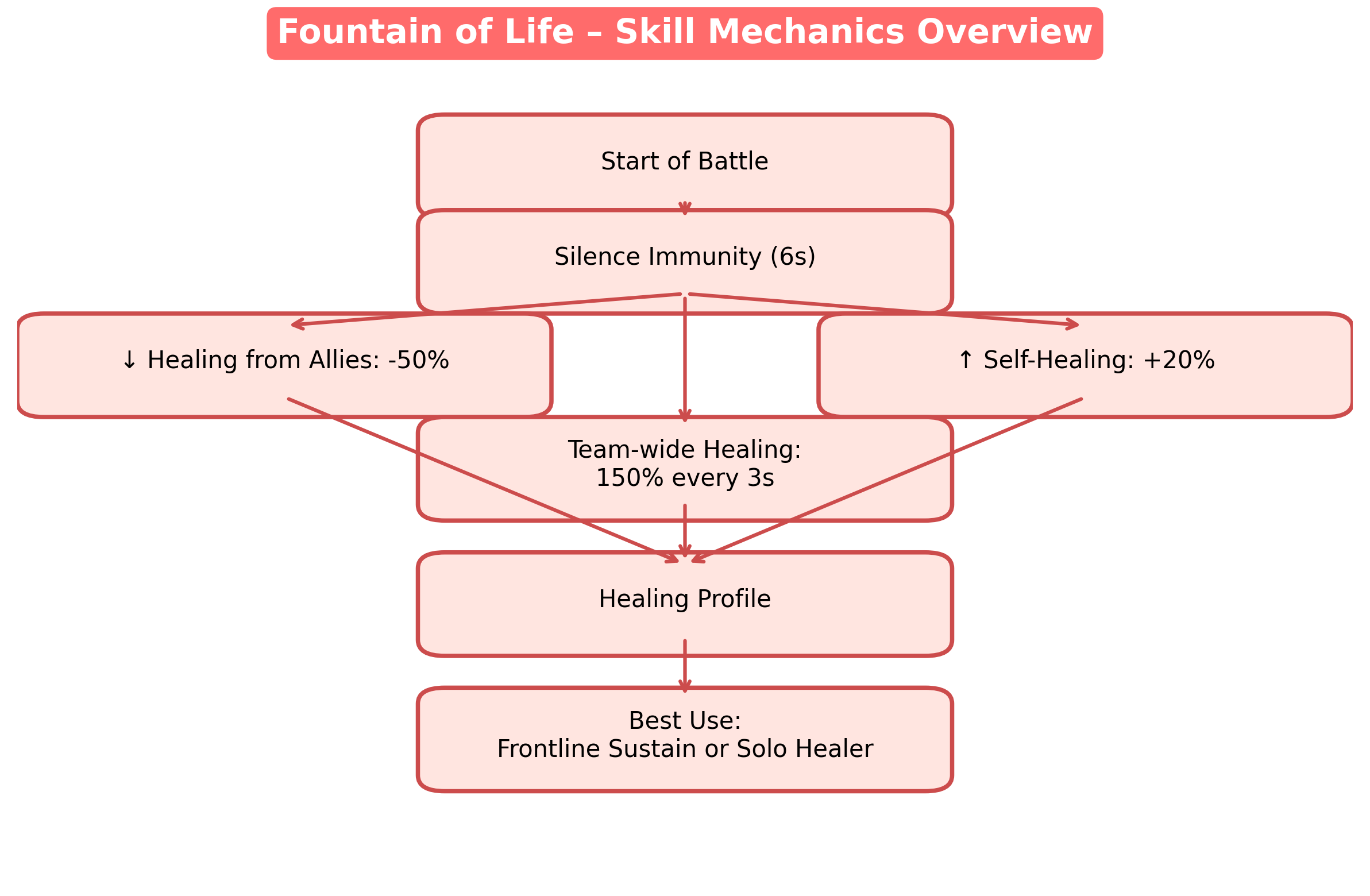 Fountain of Life provides team-wide healing every 3 seconds, with a 150% Recovery Rate. That’s a steady and dependable regeneration rhythm, although it doesn’t match the huge healing of skills like Vitality Touch or Soul Synergy.
