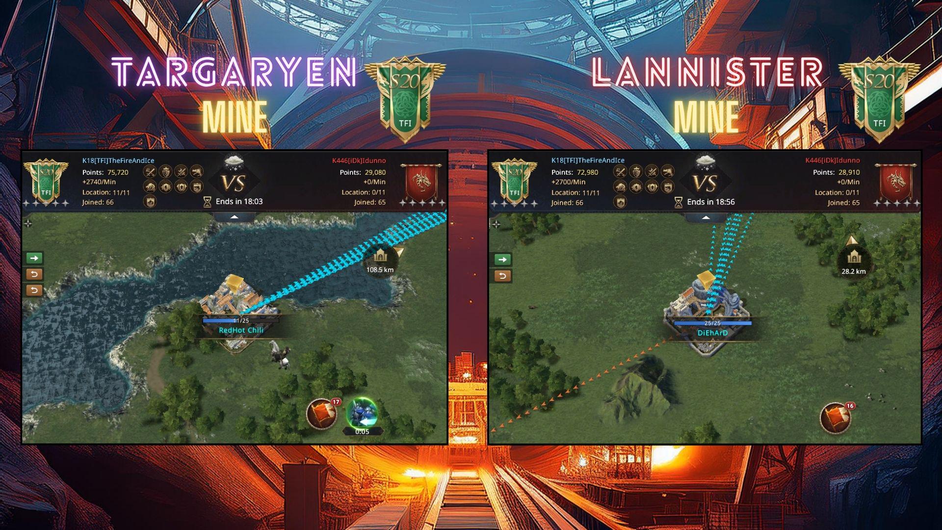 With 22 minutes remaining TFI decided to swap out DiEhArD from the Lannister Outpost just before the mines become available. “Start sending infantry to the Lannister Outpost, we will have Slymenstra hard swapped,” DiEhArD counted down from 3 and disbanded the Lannister Outpost. “They didn’t even attempt to take the Lannister Outpost, perhaps they didn’t even see it,” Slymenstra noticed not a single attack came from the iDk camp. “Alright we are ready for the mines, we give them nothing, even when we pass 80k points, make them pay,” DiEhArD had some anger in his voice, he had some unfinished business with the Faceless Men.