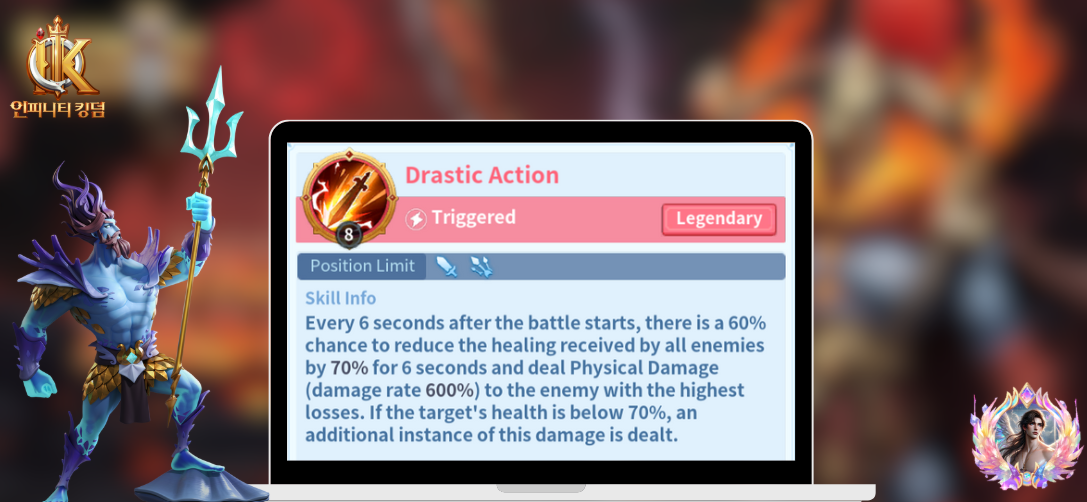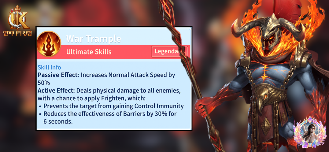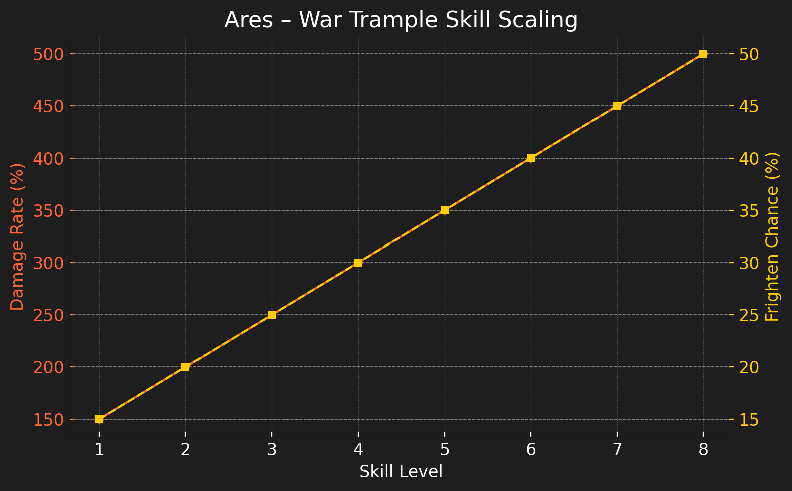 Maël’s Opinion: Ares is built for aggression. The Attack Speed buff adds pressure over time, and his AoE Frighten effect could be key in countering tanky setups or disrupting Chaos mirror matches. But as with most Chaos Immortals, his value depends on synergy—and that Normal Attack Speed stat isn’t often central in Chaos builds. Still, he brings interesting tools to explore.