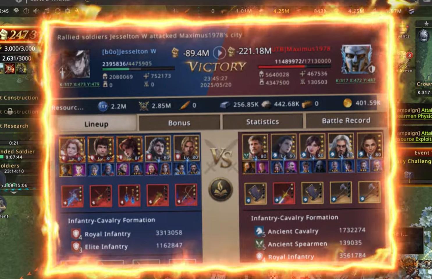 Now a filled rally and the extra account sending in a large tier 3 army to buffer for Jess's rally, marching straight through the devastated front gates they previously trampled now with far more tier 3 soldiers combined with the greater number of cavalry in Maxi's defense pushed back against Jesselton's rally. Both sides were subjected to heavy losses, yet still, the battle is convincingly won by Jesselton who whilst the Tier 4 healing cost is harsh and their allies had more than enough for the long hall, with 2 strong rally hits everyone's armies returned, taking a short break to heal and retrain troops preparing for the next assault on Maximus.