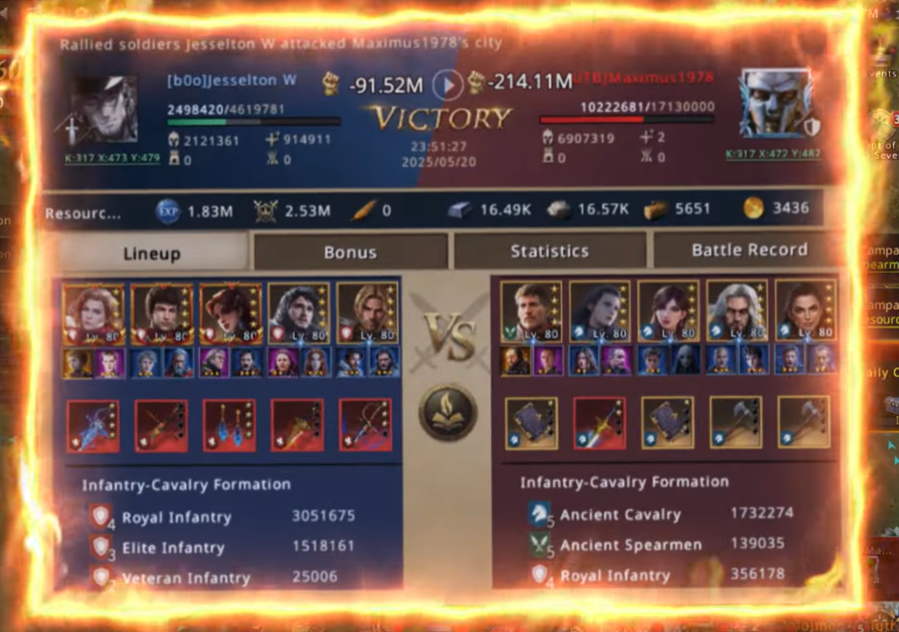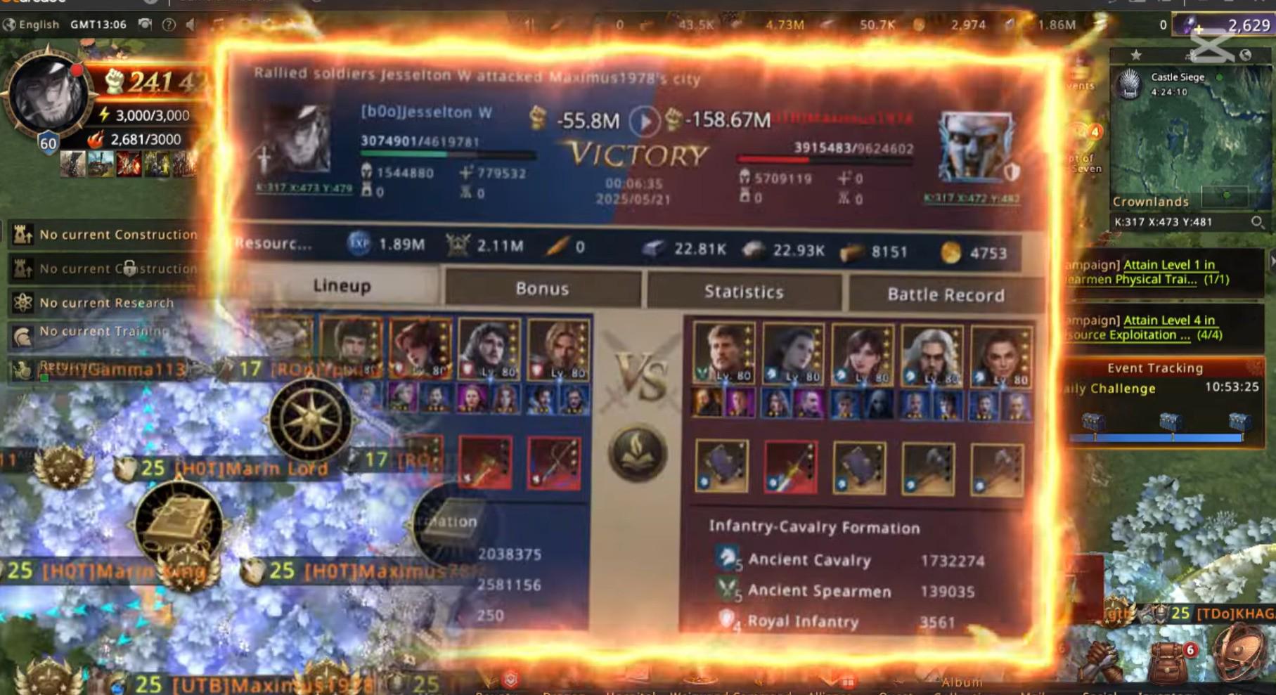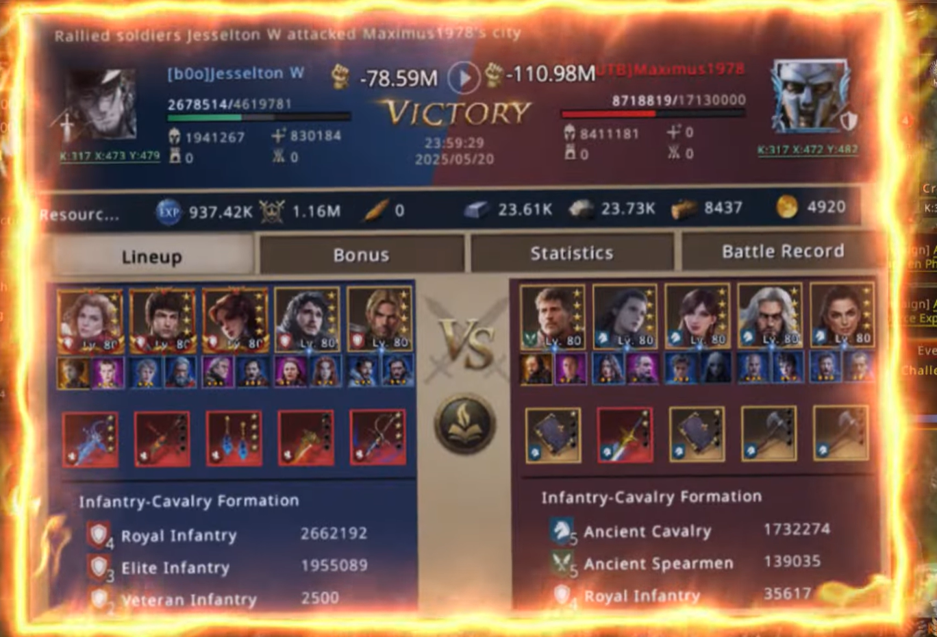 The first rally marches with no response from the kingdom, coming into contact and smashing straight through Maximus city gates to meet their front line infantry, a surprise for Jessy, whilst hitting a weak front line would normally be an advantage over their opponent's second line being well equipped still with decent counter bonus despite Jesselton's strong weapons and Daeron, allowing Maximus's cavalry an early battle upper hand, eliminating a considerable amount of Jessies Infantry. Ultimately however, Jesselton's far superior line was able to withstand the massive onslaught of Maximus's swarming cavalry, burning through their front-line infantry and dealing significant damage to their cavalry units however there would be much more to grind through to reach Maxi's tier 5 solders and capture their lord, everyone's soldiers returning to their lord's cities whilst the second rally was initiated.