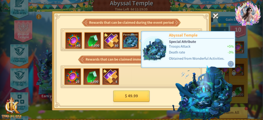 Maël’s Opinion: If you’re missing a +2% HP skin, Abyssal Temple is an easy pick. It fits the event theme, looks great, and brings solid value. The crystal-to-dollar ratio is fair, and the Holy/Shadow fragments are premium. In terms of stats, Abyssal Temple offers +Troop ATK and -Death Rate, while Skyriver Palace boosts Physical and Magical ATK with the same Death Rate reduction. Troop ATK applies more broadly, making Abyssal Temple arguably more powerful overall.