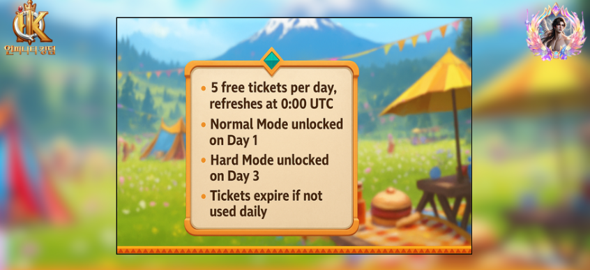You get five challenge tickets each day. Normal Mode is available from Day 1, while Hard Mode unlocks on Day 3.