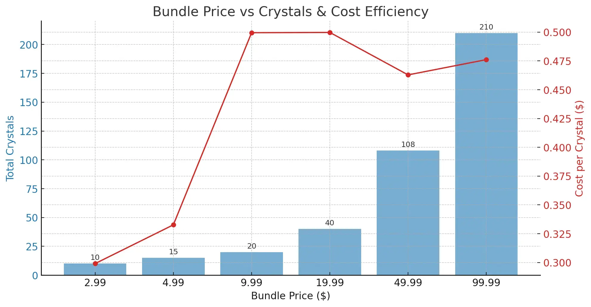 The $2.99 and $4.99 bundles give you the most value. Mid-tier options ($9.99–$19.99) don’t scale well, and the $49.99 bundle is mostly about cosmetics.