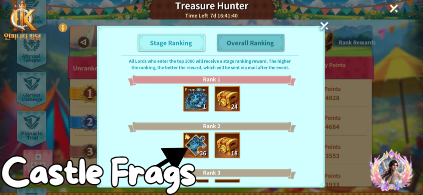 New to this event: the Abyssal Temple Castle Skin Fragments are now awarded beyond just the first place. Players ranking 2nd receive 36 fragments, 3rd place gets 24, and ranks 4th to 10th each receive 12 fragments. That slightly improves access, but it still makes Abyssal Temple the most expensive castle skin ever released. Realistically, maxing it would require placing in the top 3 almost every day — a cost that can still reach thousands of dollars. Even the Shadow Castle Skin locked behind VIP 15 and months of grinding ends up cheaper.
