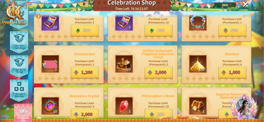 Pick up the Celebration Pass. Add a $3–$5 bundle if you want extra Crystals. Want to gamble? Try Treasure Hunter at the end when things quiet down.