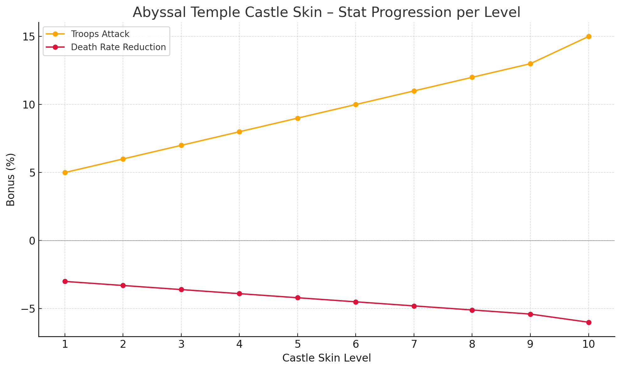 The skin starts with +5% Troop ATK and -3% Death Rate and can be upgraded up to +15% ATK and -6% Death Rate.
