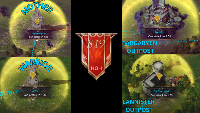 At the start HOH captured all 4 buildings, thanks to their amazing racers! The alliance first objective was to secure those buildings, by placing stronger accounts in defence. It’s part of the usual HOH tactic, so the opponents were ready to intercept if they had a chance. WAO was reading perfectly HOH’s plan and with their perfect timings, managed to occupy the Mother and Lannister Outpost. WAO brought the match to a tie, with two buildings for each side!