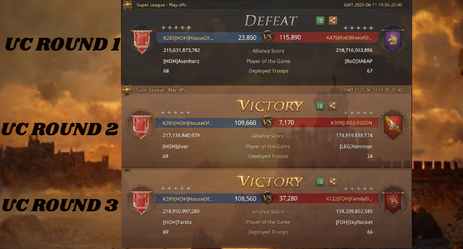 The Ultimate Conquest is less predictable than the regular season, with several factors changing from what we've become accustomed to in recent weeks. The biggest hurdle teams have to overcome - aside from opponents - is that battles have to be fought at different times - which can make roster construction very difficult and may result in fighters not being able to join. For this very reason here is a quick summary of what happened in the first 3 UC rounds.