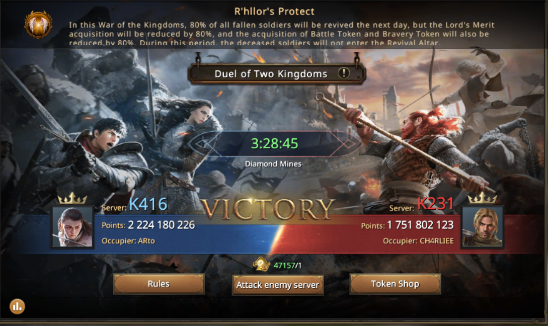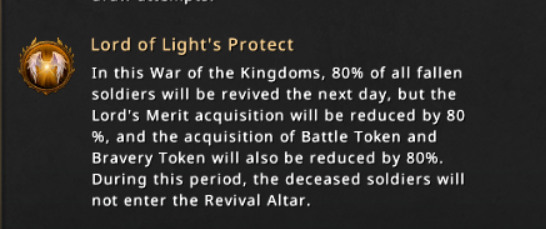 It is new edition of the event under the blessings of Lord of Light’s Protect, which means that 80% of the fallen soldiers will be revived the next day and lords can obtain merit and tokens which will be reduced with 80%. This new edition will get more participants in the event, more warriors to fight and test their battle skills with minimal loses and in the same time to obtain tokens.