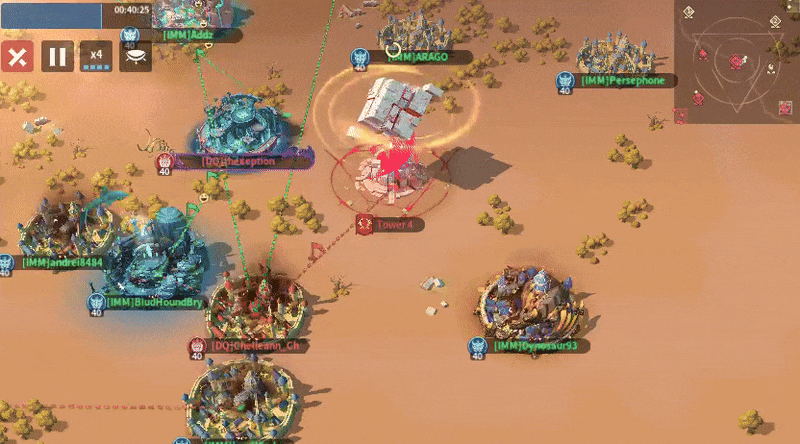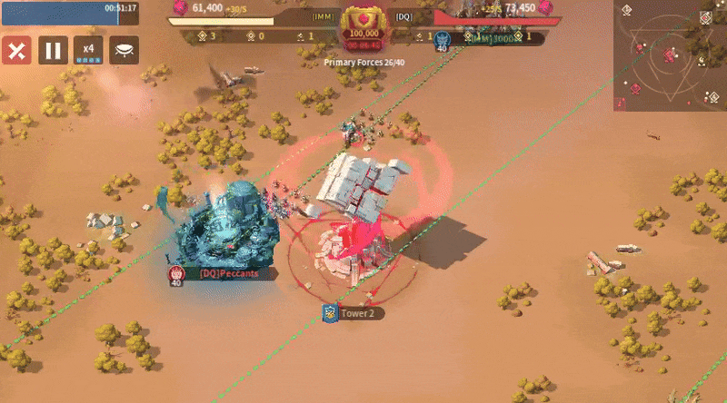 Meanwhile, there were three DQ guards defending Tower 4. IMM relocated one player near the tower, and DQ failed to destroy it. One of the guards only sent two marches when he needed to send three to destroy a relocation in IBL. Then two of the defenders inexplicably moved to the center. One more came from the spawn to reinforce the tower. The IMM invader zeroed the first one. Several more IMM relocated to the tower. DQ tried to respond, but their rotations were too slow. IMM surrounded the tower and stole it at the 40-minute mark.