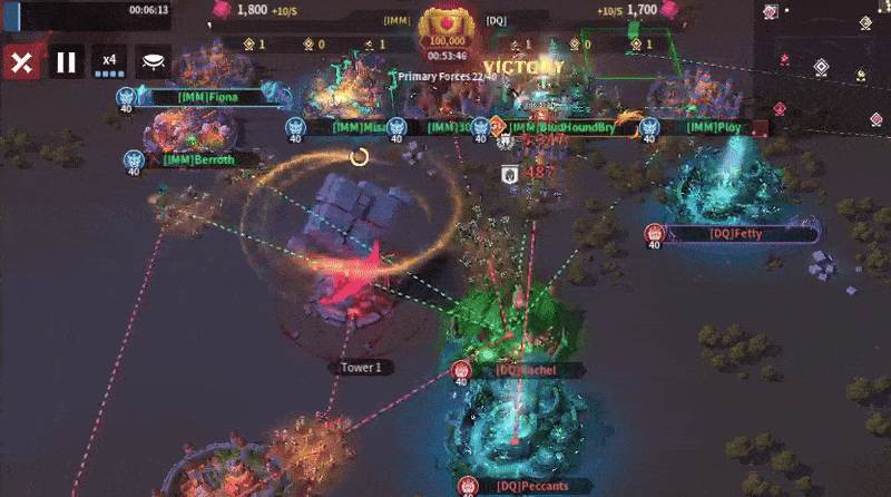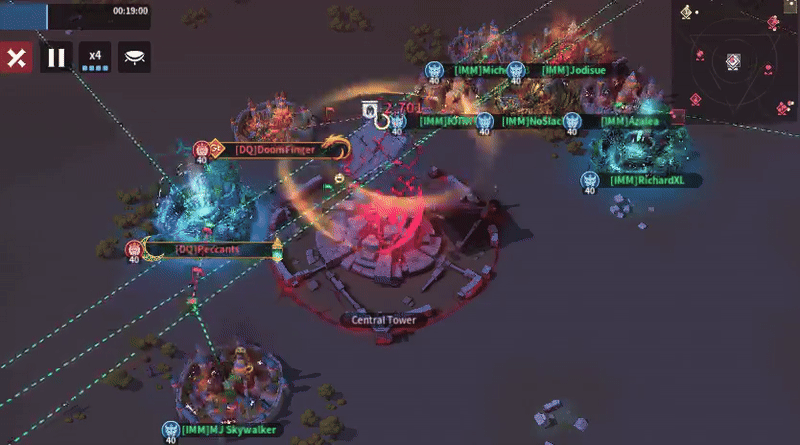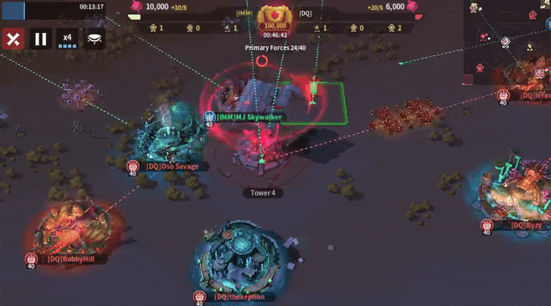 At Tower 4, DQ blocked one relocation and could have destroyed the other two, too, giving them full control of the tower. Unfortunately, the two players were too focused on the tower and let IMM finish building their relocations. DQ sent a couple more players to the tower, and IMM tried to do the same. DQ zeroed one and blocked multiple relocations. With IMM so heavily committed to the top side of the map, they had few members to spare for Tower 4. DQ zeroed the remaining enemy next to the tower, surrounded it, and finally captured it at the 13-minute mark.