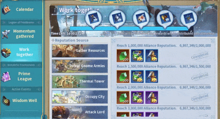 The first round of KvK-based tasks and missions started this week, just before the Zone 1 gates became available to take. There are two sets of different tasks to complete for rewards. The first set requires individual completion, while the second can be completed by everyone in the alliance. The Momentum Gathered event focuses on gathering resources, killing gnomes, defeating gnome bosses, and earning honor individually. In total, you can get 30 one-hour KvK buffs, various speedups, and a ton of resources. You’d have to reach a total of one million honor, defeat 21 bosses, kill 210 gnomes, and gather 600,000,000 resources to be eligible for all the rewards. Work Together focuses more on alliance-play. Players in the alliance can gather resources, defeat bosses, kill gnomes, build and dismantle Thermal Towers, occupy cities, and attack other players to earn reputation for the alliance. Players in the alliance will get Gems, Healing Speedups, and Training Speedups for every one million reputation reached. They will also unlock buffs that grant 5% gathering speed, 5% training speed, 5% healing speed, 5% marching speed, and 5% reputation gain. It’s rather effortless if everyone contributes.