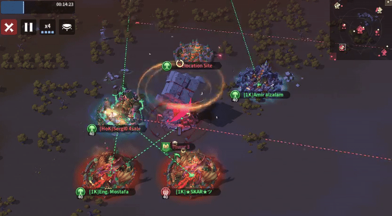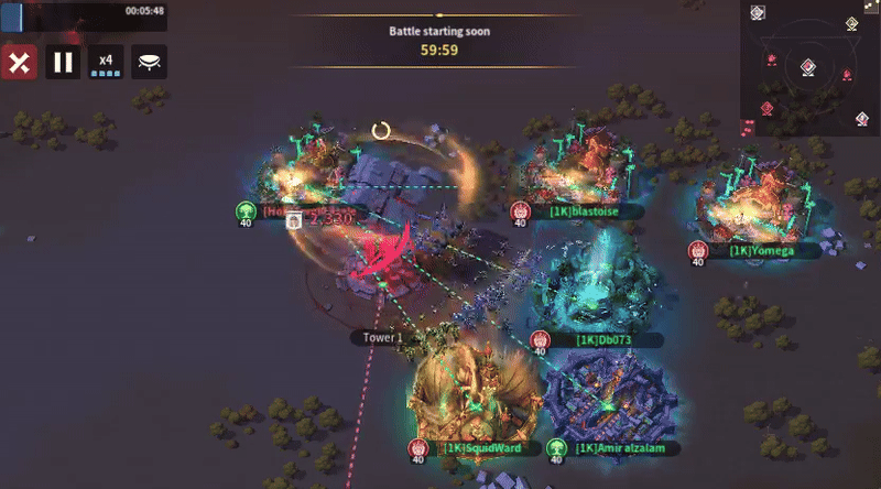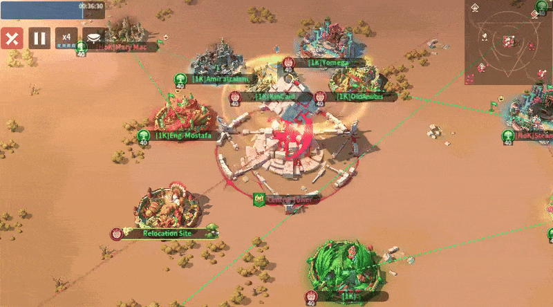 1K only sent one player to Tower 4, and HoK sent four. Typically, as the top-sided team, 1K would forgo Tower 1 and try to control Tower 4, but 1K didn’t have any good edge spawns to use to block HoK’s relocations. In this case, they should have spread the alliance evenly between Tower 1 and Tower 4. Three of HoK’s players are far from the tower, but if they can land some solo attacks and rallies, they should be able to take control easily.