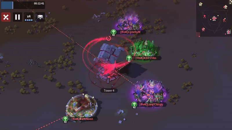 At Tower 4, 1K held off multiple members of HoK for an extended period of time because most of them were so far from the tower. HoK sent two more players to the tower, and the others moved close when they could. They finally zeroed the single enemy at the 11-minute mark and captured the tower a minute later. It should not take HoK over a few minutes to zero one person. They should have focused on rallying him before sieging the tower. They also wouldn’t need to commit so many players for one outer tower.