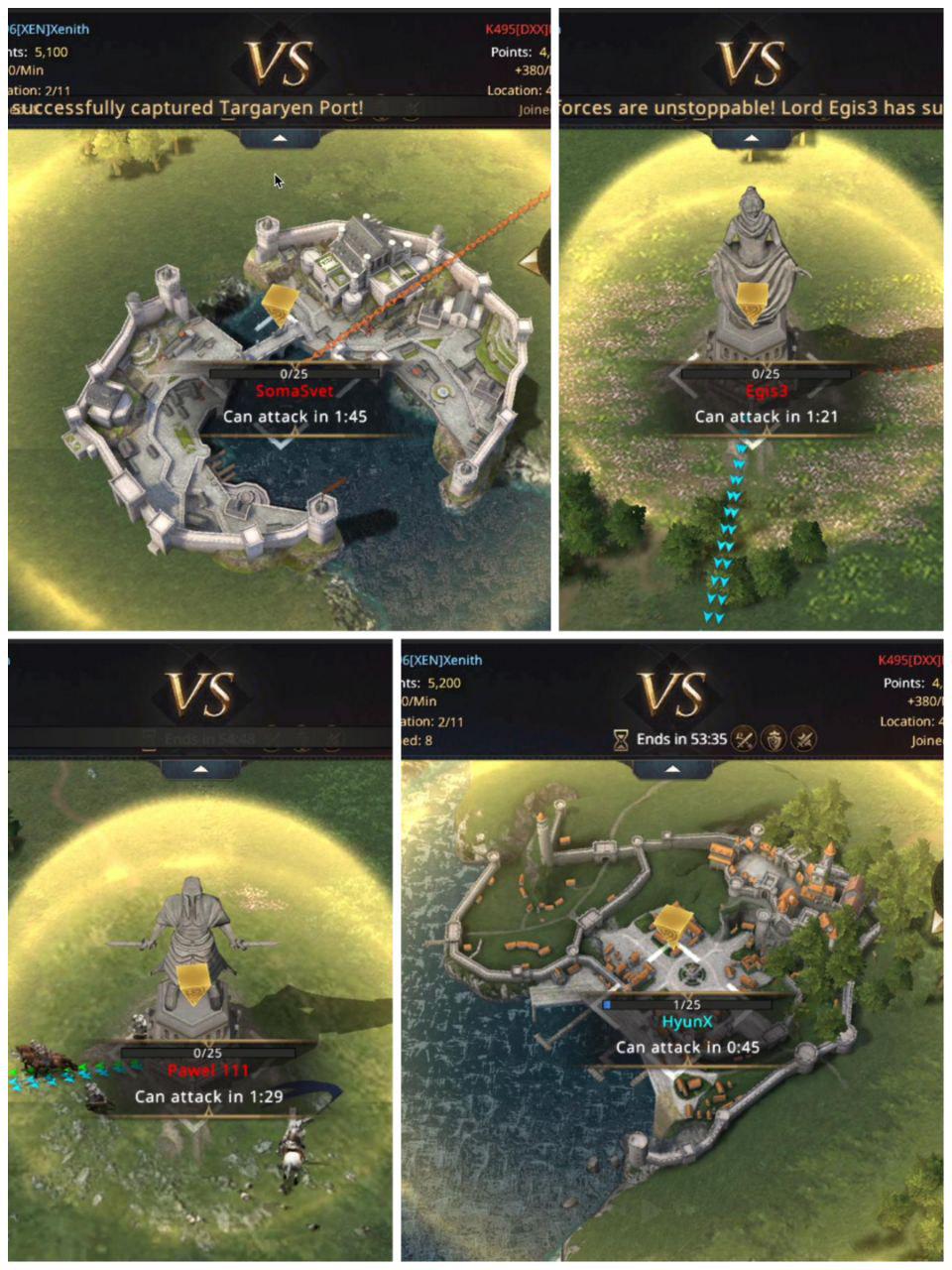 As the ports open up, XEN and DXX each get the furthest one away from them, Targaryen’s for DXX and Lannister for XEN. As this happens and XEN are distracted, DXX launch two vicious attacks on the Temple of the Mother and the Tower of the Warrior and easily take back the loosely defended buildings from XEN. This leaves XEN in a very unfavorable position as these buildings buffs added to the already very strong DXX members will make for a difficult or near impossible comeback.