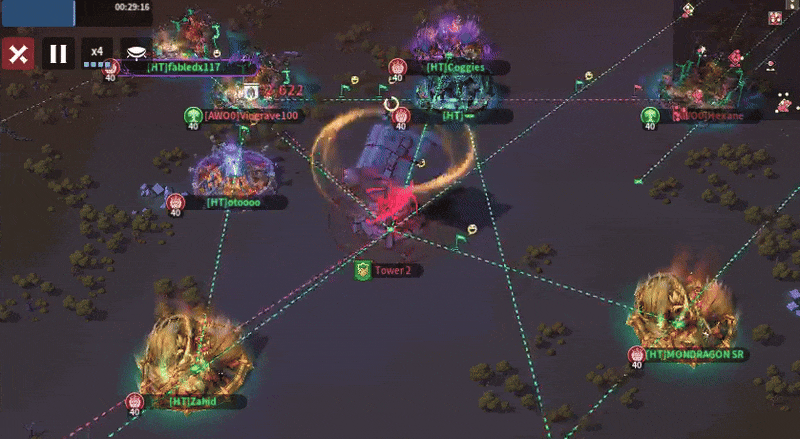 HT stationed two guards at their home tower. One guard didn’t park directly next to the tower, which is suboptimal. AWO0 had one guard defending their home tower. They also sent one to HT’s tower, which would inevitably get blocked or destroyed, so it would end up being a waste of time. The only way that works is if players leverage the invisibility given by the altars.