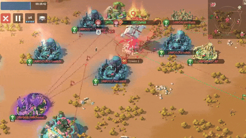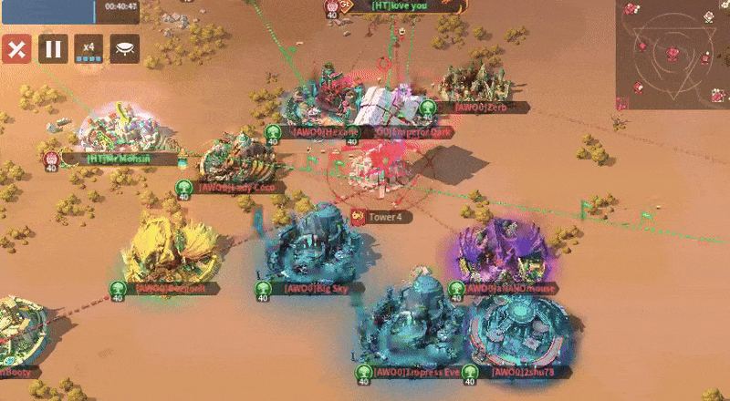 AWO0 never stopped attacking the other two outer towers. Since HT kept getting zeroed at their home tower, it forced more players to stop by to defend. That meant there were fewer players available to defend the other outer towers. Furthermore, AWO0 was relocating to the outskirts of each tower. Instead of surrounding the tower, HT relocated further and further out. Their compact formation slowly scattered and left some teammates to fend for themselves. By the 30-minute mark, there were only two guards left at Tower 1, none of whom were next to the tower. AWO0 swooped in with seven players, zeroed a guard, and stole the tower at the 38-minute mark.