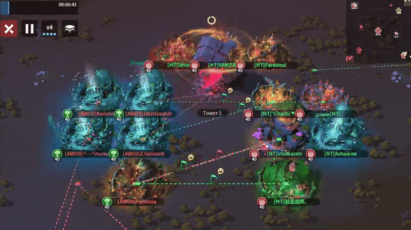 HT sent eight players to Tower 1 while AWO0 sent six. HT had better edge spawns, so they contested the corner spots of the tower. Their formation was more spread out, with more control over the area around the tower. AWO0 gave up both corner spots and gathered into one corner. HT should be able to take the tower if AWO0 doesn’t focus on defending it.