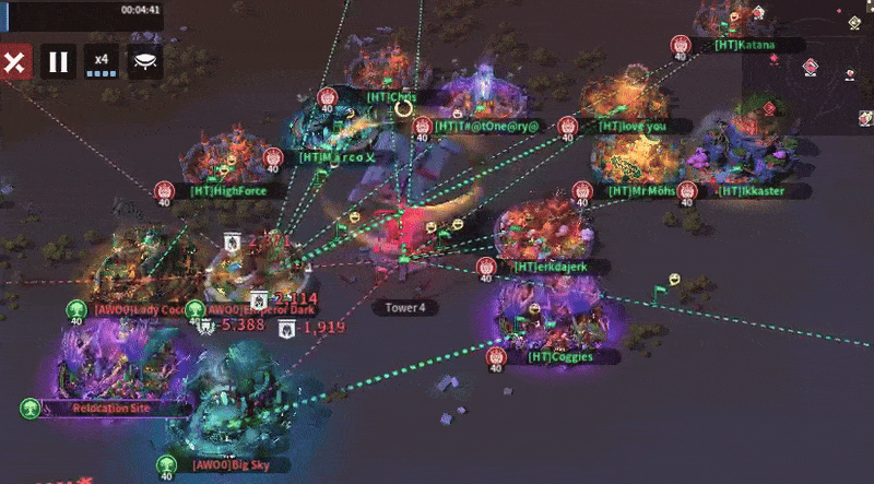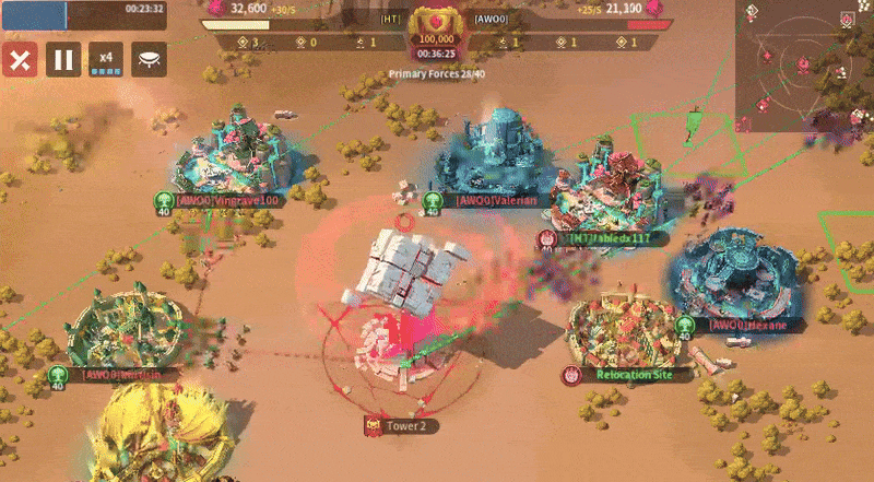 At Tower 1, every player from both alliances finished their relocations. AWO0 came out swinging, dealing massive damage to one player before HT was able to return fire. Both teams relied heavily on solo attacks instead of rallies. With their numerical advantage, HT was able to capture the tower with little difficulty a few minutes later. They also started using rallies and were able to zero an enemy. HT started positioning itself around AWO0, and AWO0 failed to destroy the relocations that were next to them. AWO0 tried to send reinforcements to the tower, but with attacks coming from multiple sides, AWO0 was unable to hold their position, and most of their players were zeroed.