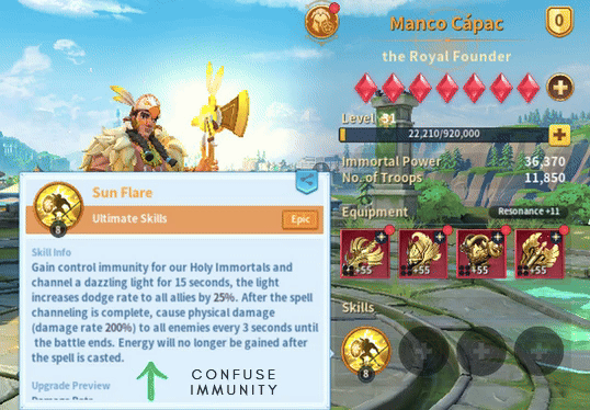 Several Holy immortals also got some love in this patch. Firstly, in addition to the Control Immunity Manco Capac’s ultimate already affords him and his Holy brethren, Manco will also be immune to Confuse effects from the likes of Loki and Lost Dimension after channeling for 15 seconds. Manco was already seldom used because he’s difficult to get and specialize, and his damage just pales in comparison to other attackers. The 25% increase in Dodge Rate for allies is also not significant, as there are so many Accuracy bonuses in the game. I do not believe the addition of Confuse Immunity will push Manco over the top and make him viable again. Nonetheless, it’s a buff.