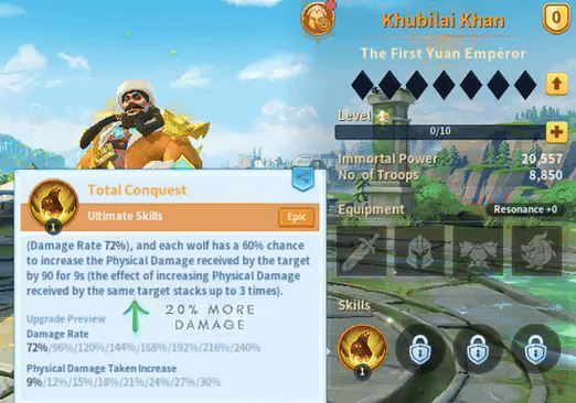 Khubilai Khan will also receive a buff. The damage of each wolf will increase from 72% + 24% per level, 240% at max level, to 78% + 26% per level, 260% at max level. In total, all five wolves will deal 100% more damage, split among random immortals. This is not much of a buff, especially since the wolves target random units. This is more of a placebo than anything else and won’t make Khubilai Khan any more viable in PvP. It’s a good buff against Titantula and Rift Breaker.
