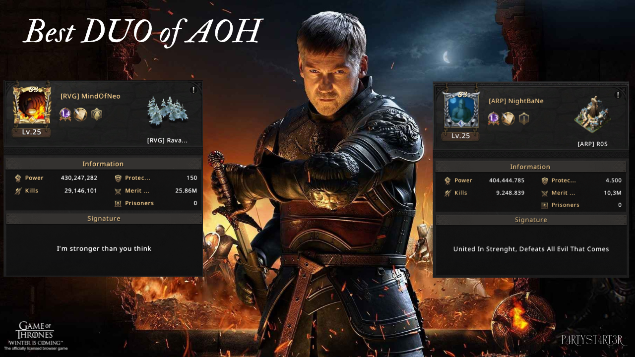In the great realm of the seven kingdoms, there is many events, where players can prove themselves and fight for victory like War of the Kingdoms, Alliance Conquest, Siege of Winterfell and many more. But today I will write about a very popular event called Arena of Honor and the legendary low power DUO that dominated it. The name of the two players is MindOfNeo and NightBaNe (before known as PEGAM).