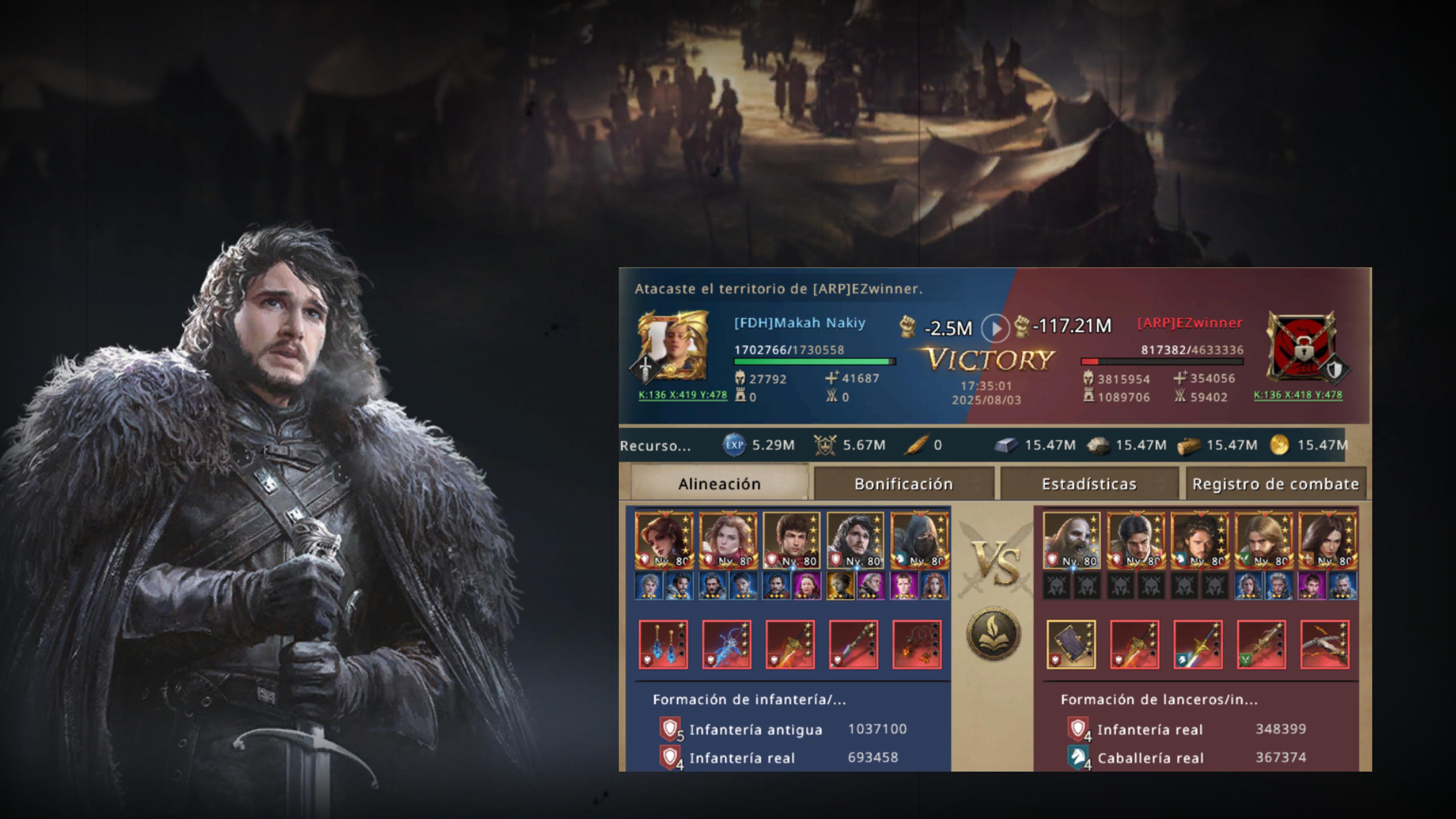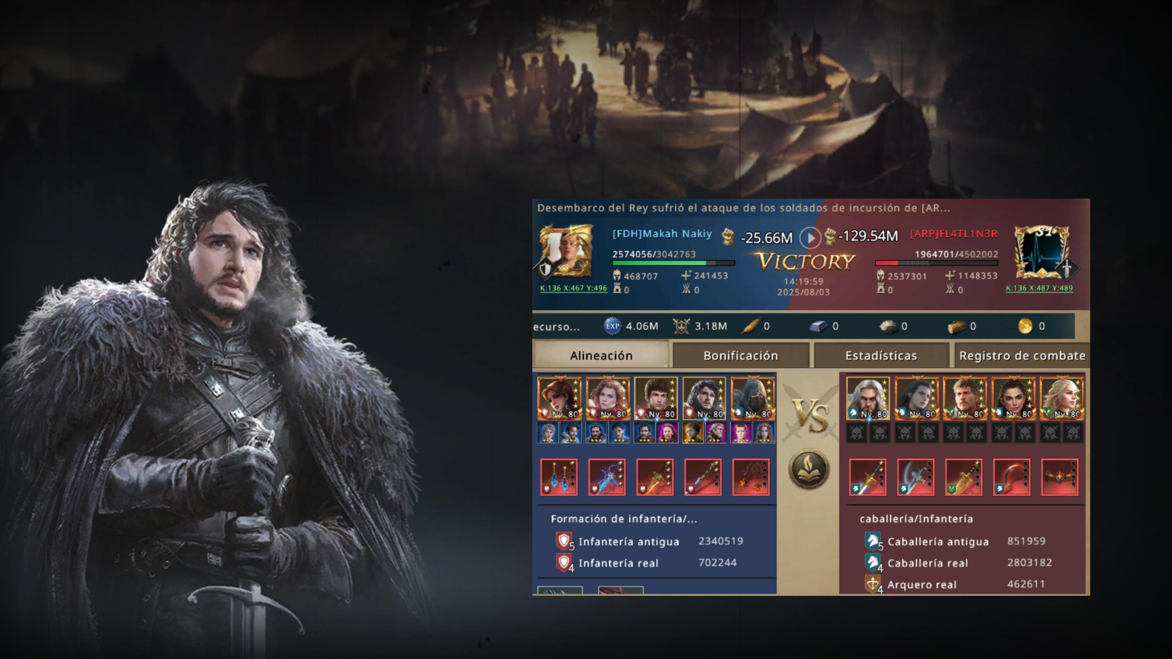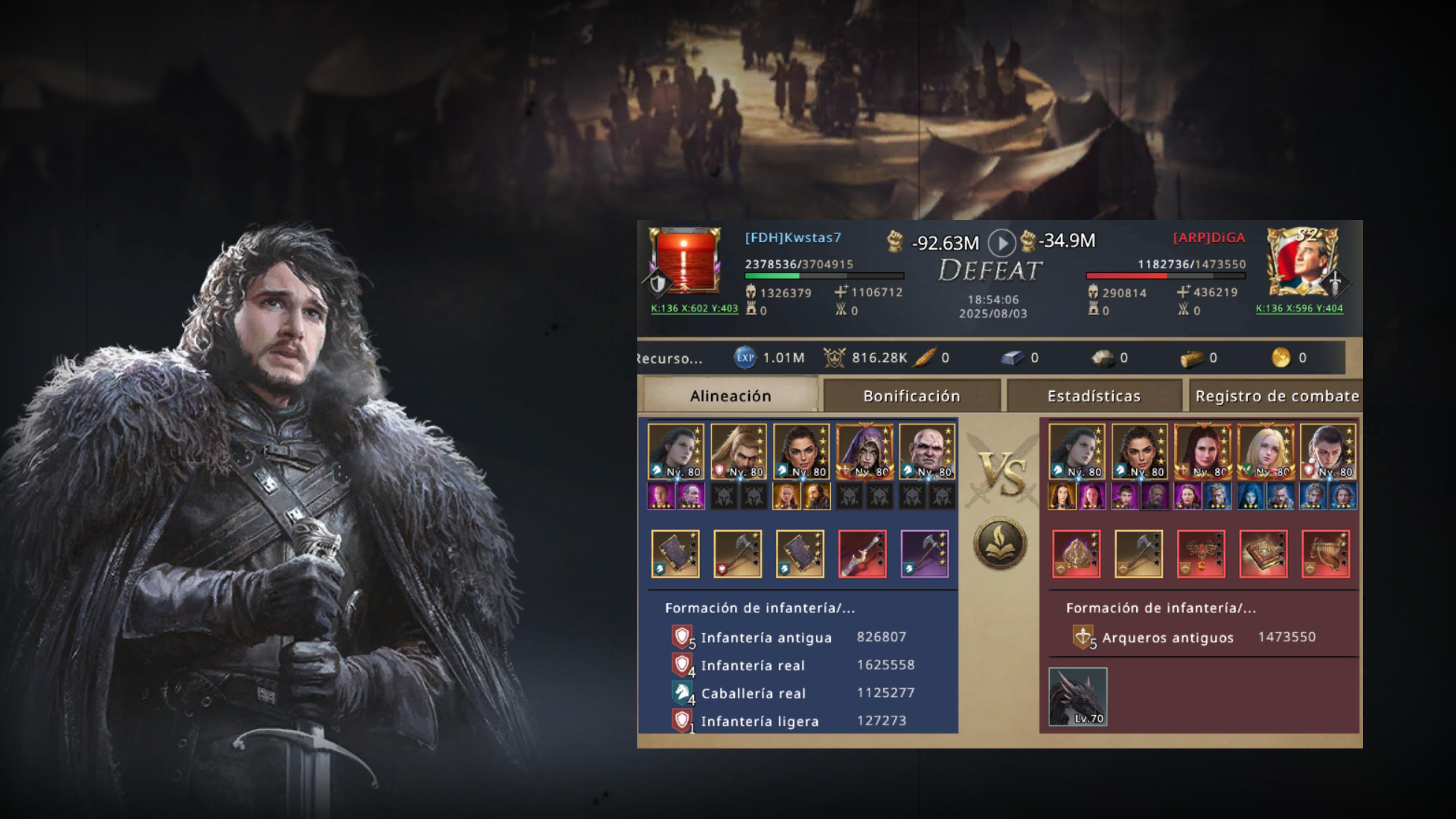 The blow was 100% sure that he would win, since he did not have his lord in the big city and added to that the damage of the counter, the losses would be minimal, to which he got annoyed and said to me: "You are a player without honor, attacking by treachery", to which I replied, calm down it is a war event, although we cannot attack each other's castles in places where there was equality of conditions it was free for anyone, it is a competition, do not bother ..., to which he withdrew annoyed because his lancers were annihilated, and a momentary truce was called, taking advantage of that, I decided to return to k136 to take King's Landing with my faithful vassal TheEND.