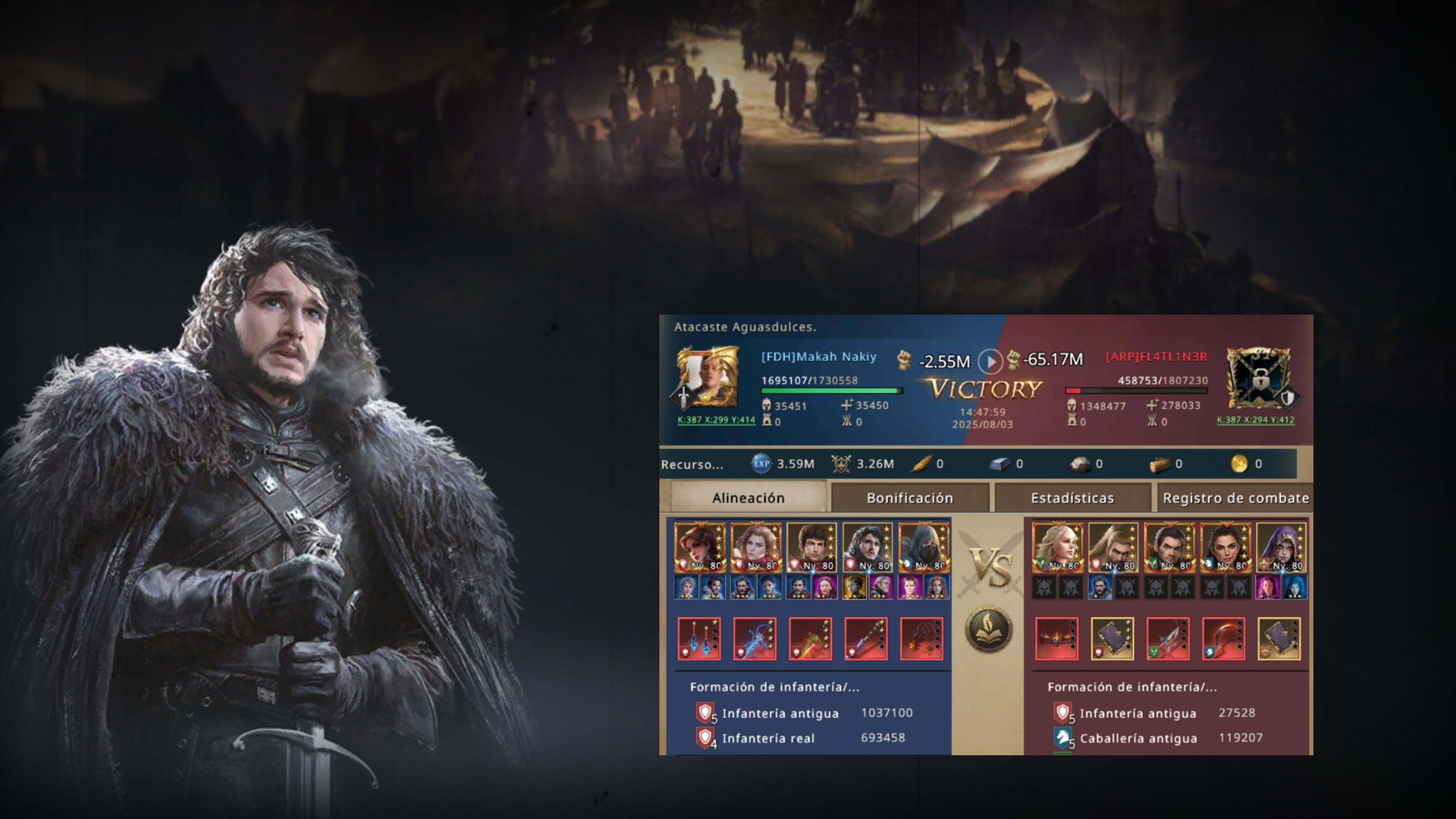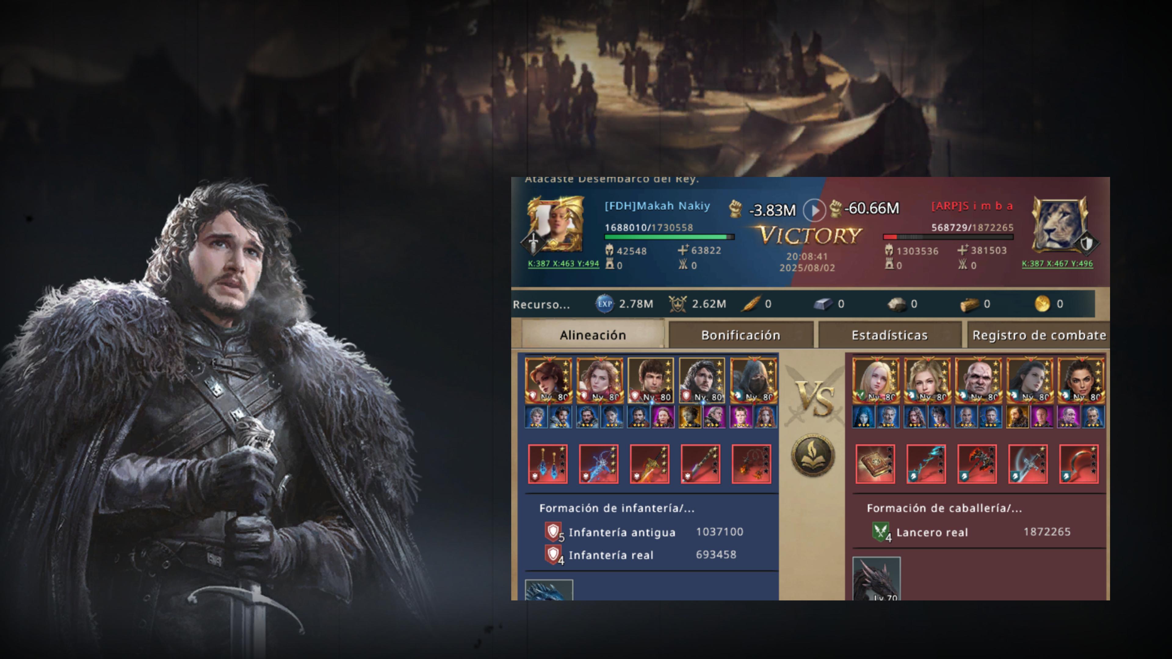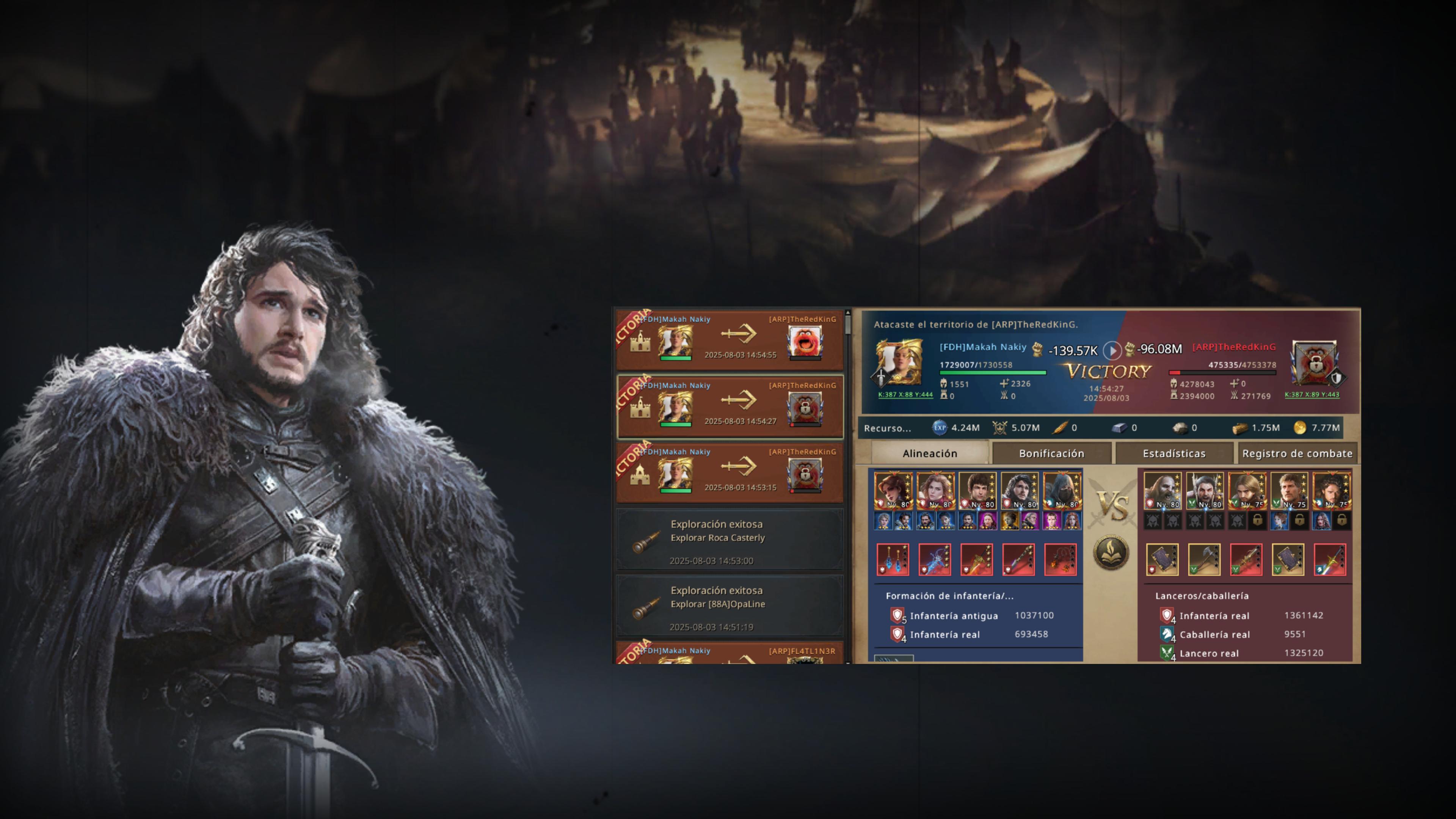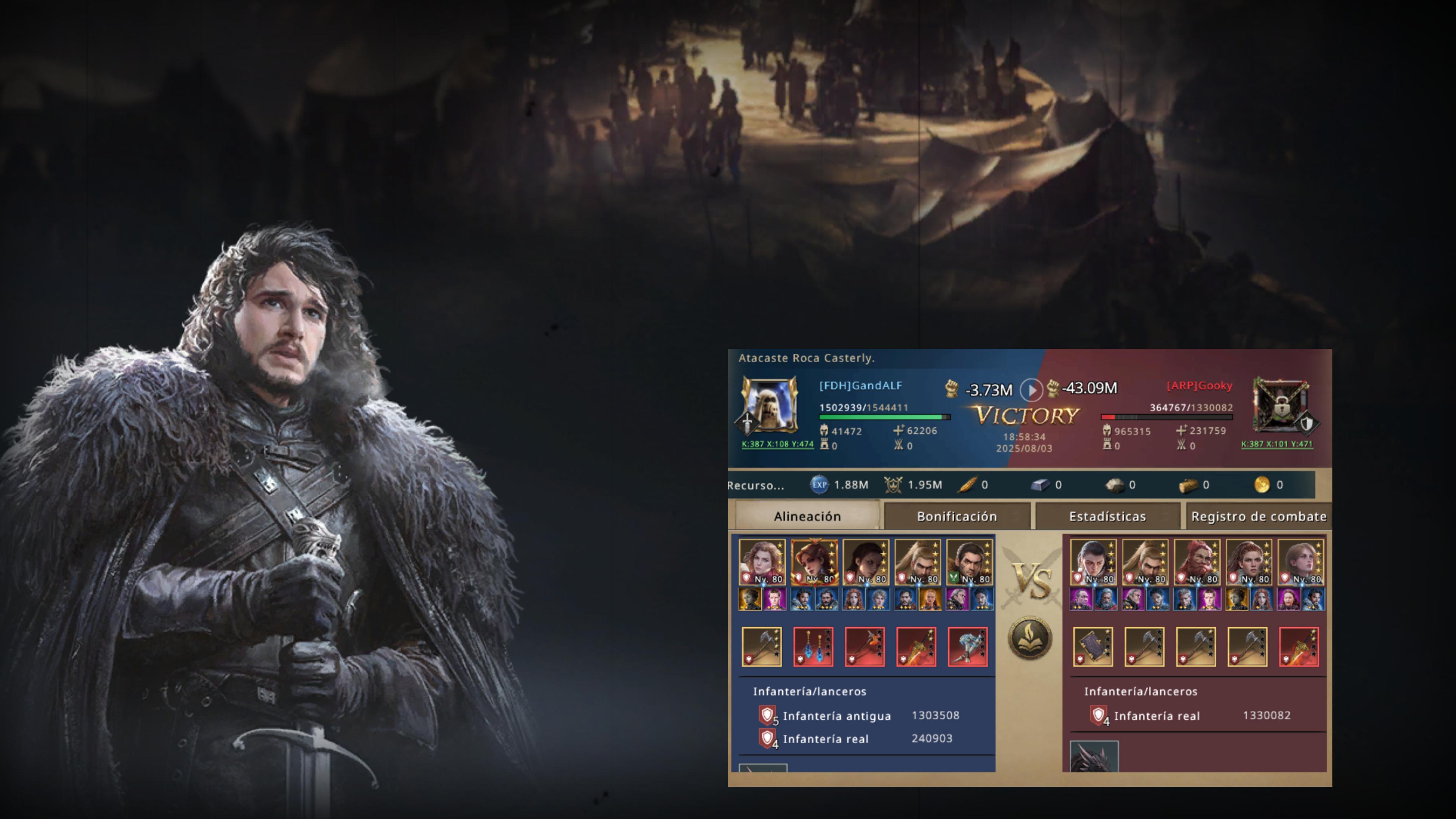 The blow was 100% sure that he would win, since he did not have his lord in the big city and added to that the damage of the counter, the losses would be minimal, to which he got annoyed and said to me: "You are a player without honor, attacking by treachery", to which I replied, calm down it is a war event, although we cannot attack each other's castles in places where there was equality of conditions it was free for anyone, it is a competition, do not bother ..., to which he withdrew annoyed because his lancers were annihilated, and a momentary truce was called, taking advantage of that, I decided to return to k136 to take King's Landing with my faithful vassal TheEND.